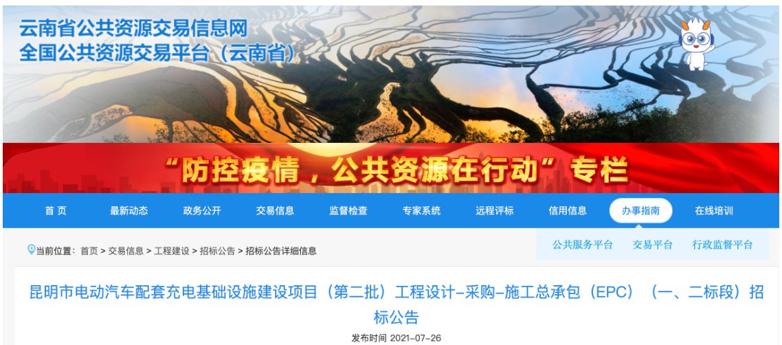 7月26日,昆明發(fā)展新能源產(chǎn)業(yè)投資運營有限公司發(fā)布昆明市電動汽車配套充電基礎設施建設項目(第二批)工程設計-采購-施工總承包(EPC)(一、二標段)招標公告。