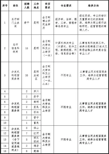 富滇銀行倡導(dǎo)和堅(jiān)持“以人為本”的人才理念,積極為應(yīng)屆畢業(yè)生提供有競(jìng)爭(zhēng)力的薪酬、完善的福利、專(zhuān)業(yè)的培訓(xùn)體系、廣闊職業(yè)晉升通道和發(fā)展平臺(tái)。根據(jù)業(yè)務(wù)發(fā)展需要,富滇銀行啟動(dòng)2019年校園招聘,現(xiàn)將有關(guān)事項(xiàng)公告如下: